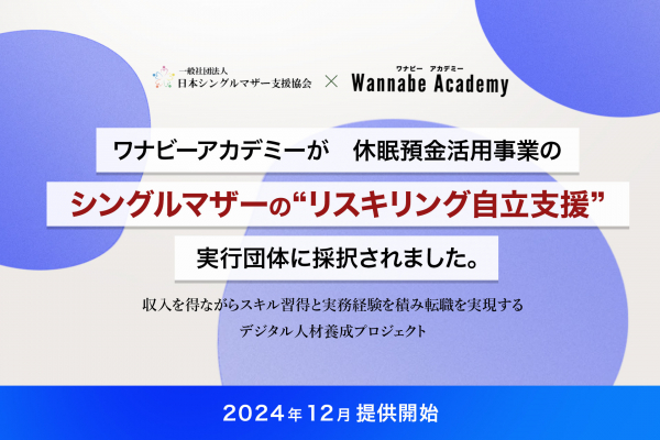 「なりたいを、あきらめない」を信念とする Web マーケター養成スクール Wannabe Academy(ワナビーアカデミー)を運営する株式会社 Shareway(シェアウェイ)(東京都杉並区:代表取締役 森田吏)は、一般社団法人日本シングルマザー支援協会(神奈川県横浜市:代表理事 江成道子)が資金分配団体として採択された休眠預金活用事業「団体と自治体・企業との広範なネットワーク形成を通じてシングルマザーに対する自立支援パッケージの構築を目指す」の実行団体に決定いたしました。