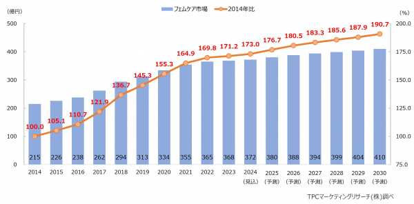 ◆その結果、2023年の市場規模は、前年比0.8%増の368億円となった。同市場は、この10年間で約1.7倍に拡大している。市場拡大の要因としては、女性の健康問題が顕在化し、PMSや更年期の認知・対策意識が高まったことや、製品の技術開発の活発化に伴いフェムケアカテゴリーの多様化が進んでいることが挙げられる。