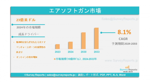 Surveyreportsの専門家はエアソフトガン市場の調査を分析し、2024年のエアソフトガン市場規模は23億米ドルに達すると予測した。さらに、エアソフトガン市場のシェアは、2033年末までに45億米ドルに達すると予測されている。エアソフトガン市場は、2024年から2033年の予測期間にわたって、年間平均成長率(CAGR)約8.1%で成長すると予測されている。
