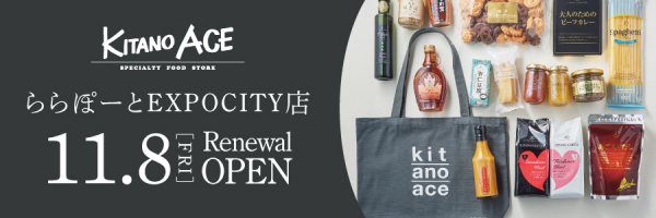 2015年に「KITANO ACE ONE ららぽーとEXIPOCITY店」としてオープンした店舗が、この度「KITANO ACE ららぽーとEXIPOCITY店」として生まれ変わります。店名・店舗ロゴを一新し、より北野エースらしい商品ラインアップ、商品展開が加わってリニューアル。これまで設置のなかったカレーなる本棚(R)やふりかけの壁、取り扱いの少なかったプライベートブランド「キタノセレクション」商品も新たに追加されます。