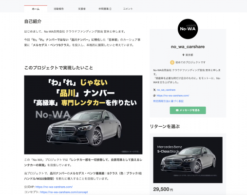 特に、支援額に応じて割引価格でのメルセデス・ベンツ利用権や、No-WA限定の特典を提供予定です。