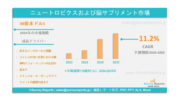 Surveyreportsの専門家は、脳機能改善サプリメント市場の調査分析を行い、2024年の脳機能改善サプリメント市場規模は48億米ドルに達すると予測した。さらに、脳機能改善サプリメント市場のシェアは、2033年末までに102億米ドルに達すると予測されている。脳機能改善サプリメント市場は、2024年から2033年の予測期間にわたって、年間平均成長率(CAGR)約11.2%で成長すると予測されている。