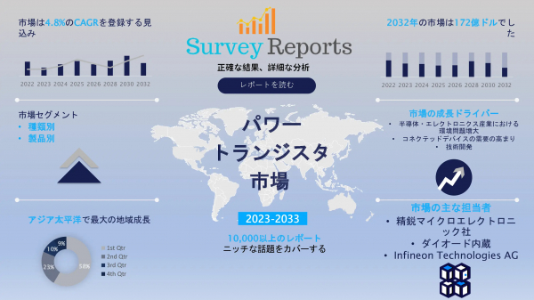 Surveyreportsの専門家は、パワートランジスタ市場の調査を分析し、2023年のパワートランジスタ市場規模は172億米ドルに達すると予測した。さらに、パワー トランジスタ市場のシェアは、2032年末までに276億米ドルに達すると予測されている。パワー トランジスタ市場は、2024年から2033年の予測期間にわたって、年間平均成長率(CAGR)約4.8%で成長すると予測されている。