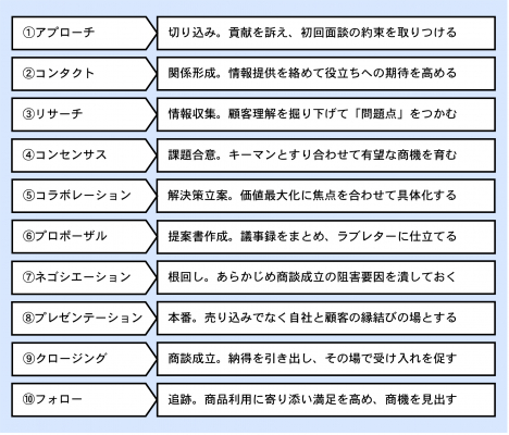 業種や企業によってプロセスは異なりますが、例を挙げれば「アプローチ⇒コンタクト⇒リサーチ⇒コンセンサス⇒コラボレーション⇒プロポーザル⇒ネゴシエーション⇒プレゼンテーション⇒クロージング⇒フォロー」というステップで構成されます。