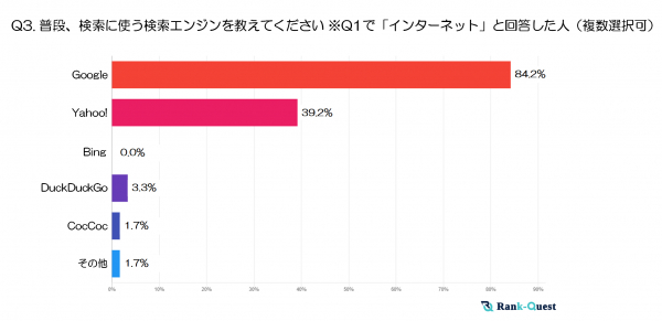 最も多かった回答は「Google」で、全体の84.2%が利用していると回答しました。次いで「Yahoo!」が39.2%で、その他の検索エンジン(DuckDuckGo、CocCocなど)の利用はごく少数にとどまりました。