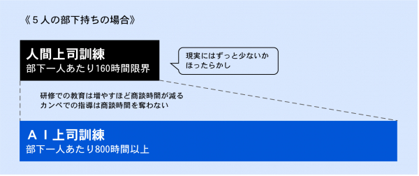 OJTに割ける時間は5人の部下持ちなら育成に熱心な上司でも一人あたり年間160時間が限界ですが、AIなら一人当たり年間800時間を当てられます。
