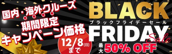 11月30日までの期間限定でブラックフライデーセール行っておりましたが、大好評につき12月8日(日)まで延長することといたしました。最大でクルーズ料金が50%も割引となる商品もご用意しております!海外発着クルーズ、日本発着外国船クルーズ、日本発着日本船クルーズそれぞれでお得なコースがご用意されております。ぜひ、この機会にクルーズ旅行をご検討ください!