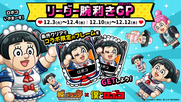 12月10日(火)より、アニメ『僕とロボコ』コラボ限定キャラ「ロボコ」をリーダーにして「キャラフレP」を競う、「リーダー腕利きGP」の2回戦目が開催!ランキング上位者や条件を達成した方には、コラボ限定「キャラフレーム」が贈られます。「ロボコ」をリーダーにして期間中のリーグに挑みましょう!