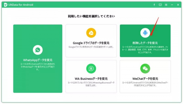 1.UltData for AndroidをPCにダウンロードして起動します。メニュー画面が表示されたら「削除したデータを復元」を選択します。