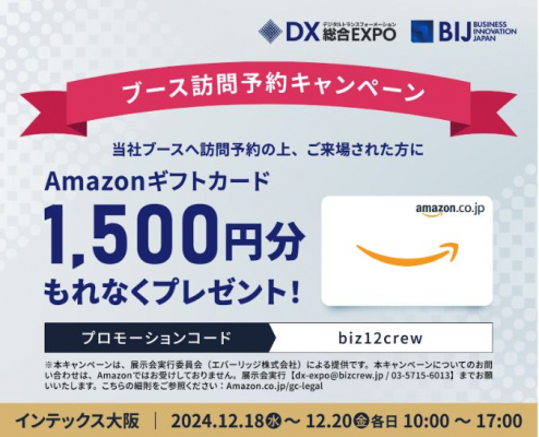 今回、弊社専用のキャンペーンコードをご記入の上、バイタリフィブースの訪問予約をしていただきますと、展示会事務局より「Amazonギフト券 1500円分」をプレゼント致します。