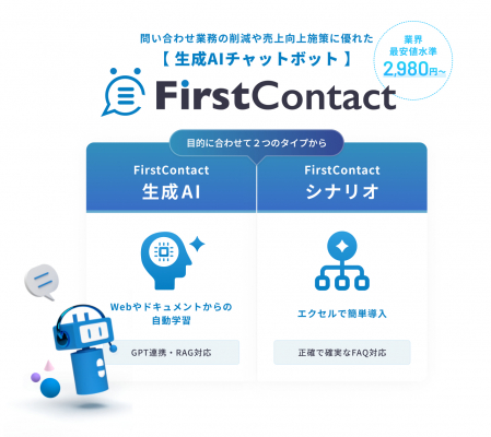 『FirstContact』はコストパフォーマンスに優れた生成AIチャットボット。シナリオ型と生成AIをハイブリット利用でき、成果と費用のバランスに優れた製品です。