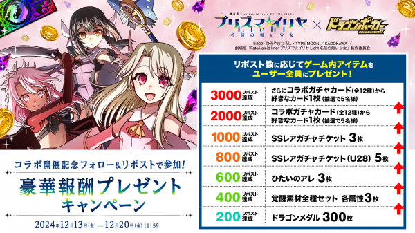 12月13日(金)より、劇場版『Fate/kaleid liner プリズマ☆イリヤ Licht 名前の無い少女』とのコラボ開催を記念して「コラボ開催記念!フォロー&リポストで参加!豪華報酬プレゼントキャンペーン」を実施いたします。対象ポストのリポスト数に応じて、ゲーム内アイテムやギフトカードをプレゼント!たくさんのご参加、お待ちしています!