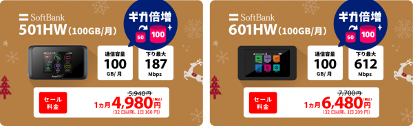 ・SoftBank 501HW(通常50GB/月→100GB/月)※1