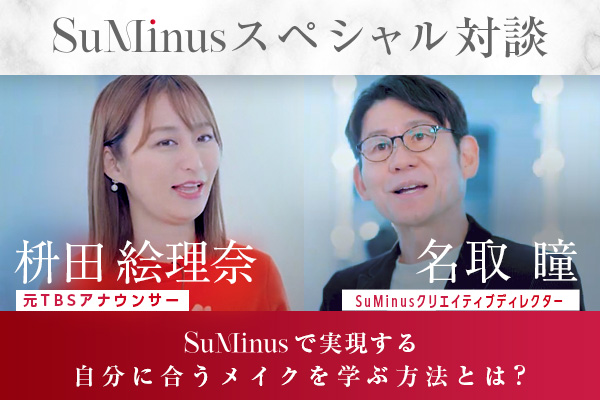 対談前に枡田さんには「SuMinus」新宿店で実際に名取のメイクを受けていただき、ご自身の普段のメイクとの違いを体験いただきました。枡田さんご自身はアナウンサー新人研修の際に一度メイク研修を受けただけで、以降は独学でメイクにチャレンジしてきたということで、改めてプロならではのメイクの見せ方・「SuMinus」で学べるスキルや効果を直接知っていただける場となりました。
