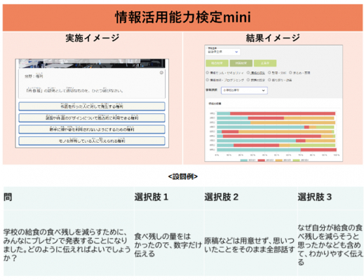 また、「情報活用能力検定mini」では『情報モラル・セキュリティ』、『課題の設定』、『情報の収集』、『整理・分析』、『まとめ・表現』、『ふりかえり・改善』といったスキルが1つの探究課題を解決するというテーマ設計のもと、クイズ形式で出題され、それぞれ習熟度を計ることができます。そのため、子ども達の指導の一つの目安としてご活用いただけます。
