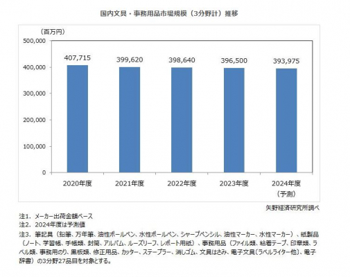 2024年度の国内文具・事務用品市場規模は、メーカー出荷金額ベースで前年度比0.6%減の3,939億7,500万円を予測する。