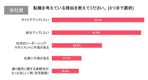 転職を考えている対象者の理由としては「キャリアアップ」、「給与アップ」、「社内のリーダーシップ・マネジメントへの不満」が上位に挙げられました。
