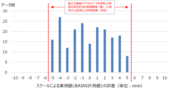 国土交通省が2023年7月に策定した「デジタルデータを活用した鉄筋出来形計測の実施要領(案)」では、床版工以外の構造物では鉄筋10本程度の平均間隔で性能評価を行います。一方で、床版工では個々の鉄筋について実測値と計測値の許容誤差が定められており、かつその許容誤差は±5mmが目安とされており、一層高い計測性能が求められております。