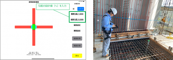 また、床版では縦横断方向に勾配を設けることも多く、このような場合に配筋へ計測面を合わせることが難しいという課題が判明したことから、予め勾配の設計値を入力し計測面に反映する機能を追加しました。