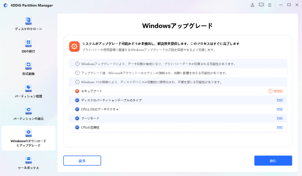 TPM2.0やセキュアブートなどのWindows11 24H2のシステム要件を満たしていない場合、4DDiG Partition Managerを使って簡単に回避できます。