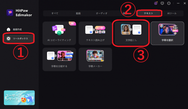 ソフトを起動後、「ツールボックス」>「テキスト」>「文字起こし」を選択して動画をインポートします。これにより自動で音声認識して字幕が生成されます。
