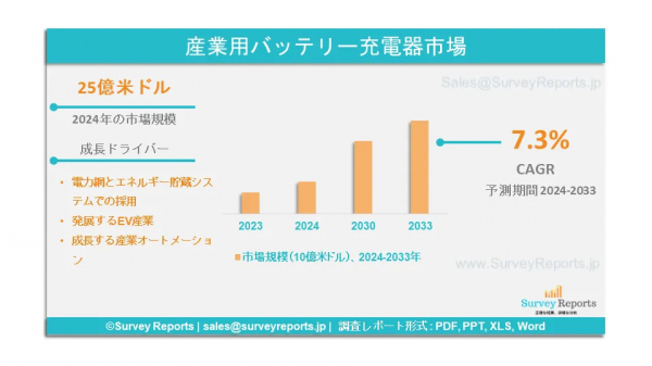Surveyreportsの専門家は産業用バッテリーチャージャー市場の調査を分析し、2024年に産業用バッテリーチャージャー市場規模が25億米ドルに達すると予測した。さらに、産業用バッテリー充電器市場のシェアは、2033年末までに53億米ドルに達すると予測されている。産業用バッテリー充電器市場は、2024年から2033年の予測期間にわたって、年間平均成長率(CAGR)約7.3%で成長すると予測されている。