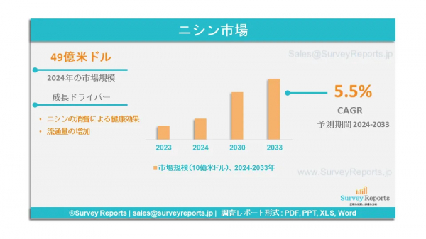 Surveyreportsの専門家は、ニシン市場の調査を分析し、2024年のニシン市場規模は49億米ドルになると予測した。さらに、ニシン市場のシェアは、2033年末までに75億米ドルの収益に達すると予測される。ニシン市場は、2024年から2033年の予測期間にわたって、年間平均成長率(CAGR)約5.5%で成長すると予測される。