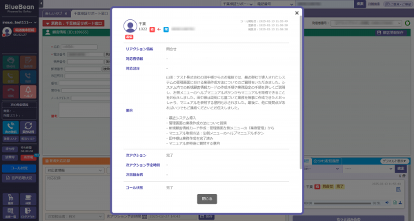 処理結果は該当顧客の対応履歴に自動で反映されるため、オペレーターはステータス変更など最低限の履歴登録のみを行い、次の電話対応に集中できます。
