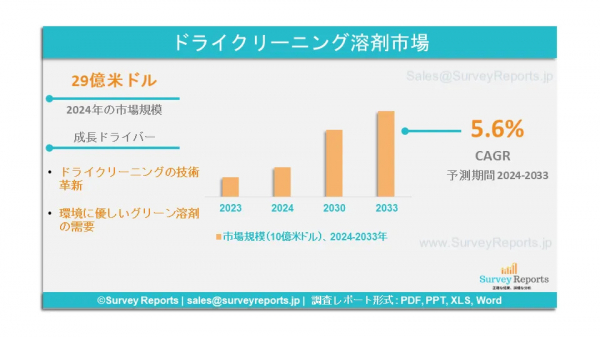 調査レポートの専門家はドライクリーニング溶剤市場の調査分析を行い、ドライクリーニング溶剤市場規模は2024年には29億米ドルに達すると予測した。さらに、ドライクリーニング溶剤市場のシェアは、2033年末までに49億米ドルに達すると予測されている。ドライクリーニング溶剤市場は、2024年から2033年の予測期間中に、年間平均成長率(CAGR)約5.6%で成長すると予測されている。