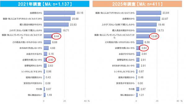 購入経験を問う設問に対して、ベビーカーを「購入していない」と回答したママパパに理由を聞いたところ、「親族・知人にプレゼントしてもらった」と回答した割合が4.21ポイント増加(2021年調査:8.44%、2025年調査:12.65%)していることが分かった。ベビーカー購入に際して、ママパパ以外の購入者(祖父母など)についても考慮する必要があるだろう(図2)。