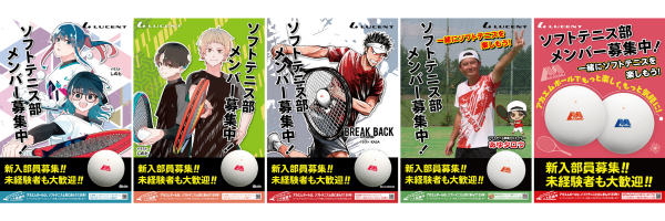 4月7日からポスターデザインが5種類になりました。ソフトテニス漫画『顧問など!』でお馴染みのしのと先生にご協力いただいたデザインが2種類と、月刊少年チャンピオンで本格テニス漫画『BREAK BACK』を連載中のKASA先生にご協力いただいたデザインが1種類、そして今回追加されたあゆタロウさんのデザインが1種類と、アカエムデザインの1種類です。