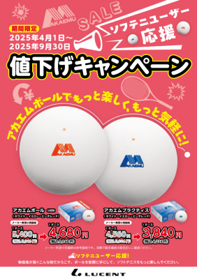 ソフトテニス公認球『アカエムボール』ならびに練習球『アカエムプラクティス』の価格を大幅に下げて販売するキャンペーンです。