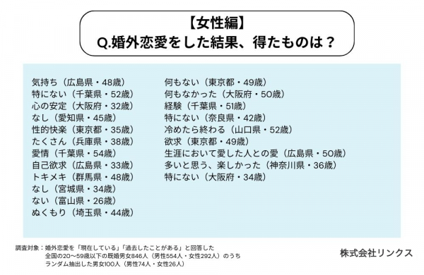 そして、婚外恋愛で得たものについて。男性は「快楽」「癒し」が多かったのに対し、女性は「特にない」という回答が多く寄せられました。実際には、得られたものより失ったもののほうが大きいのかもしれません。