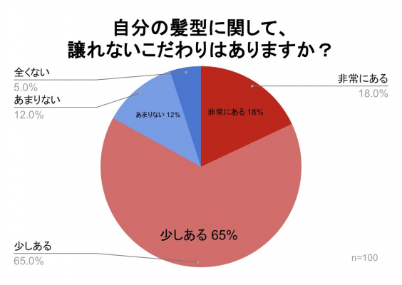 「自分の髪型に関して、譲れないこだわりはありますか?」の質問では、『非常にある』が18%、『少しある』が65%、『あまりない』が12%、『全くない』が5%という結果となりました。