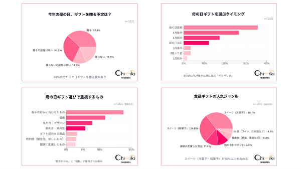 一方、ギフトを選ぶタイミングについては、「母の日直前」が35.7%で最も多く、次いで「4月後半」が26.6%、「母の日当日」が12.1%という結果に。