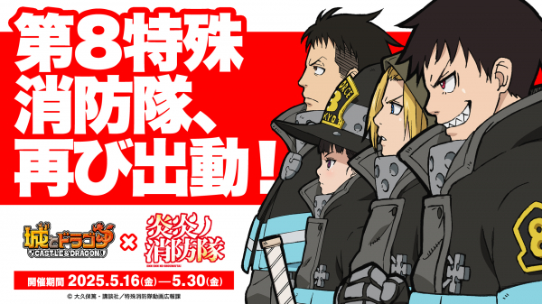 5月16日(金)より『城とドラゴン』にて、TVアニメ『炎炎ノ消防隊』との復刻コラボイベントを開催することが決定いたしました。コラボ限定キャラ「森羅 日下部」や、城ドラキャラの新しい激レアお着替えが登場するほか、5月9日(金)からは「コラボ直前!フォロー&リポストキャンペーン」をSNSにて実施いたします。ぜひこの機会をお見逃しなく!