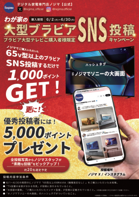 株式会社ノジマ(神奈川県横浜市 代表執行役社長 野島廣司 以下「ノジマ」といいます)は、ノジマでSONYの65型以上のテレビをご購入いただき、SNSで「#ノジマでソニーの大画面」とともに写真を投稿していただいたお客様に、ノジマポイント1,000円分をプレゼントするキャンペーンを実施いたします。