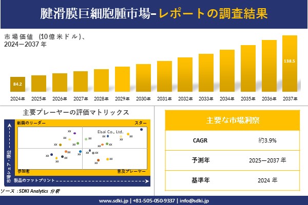 腱滑膜巨細胞腫市場に関する当社の調査レポートによると、腱滑膜巨細胞腫市場規模は 2037 年に約 138.5億米ドルに達すると予想されています。さらに、2024 年の 腱滑膜巨細胞腫市場規模は約 84.2億米ドルとなっています。腱滑膜巨細胞腫に関する市場調査レポートでは、市場は 2025-2037 年の予測期間中に約 3.9% の CAGR で成長するとも述べられています。