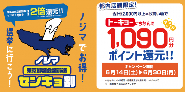 東京都議会議員選の投票済証明書もしくは投票所の看板の写真のご提示で1,090円分のポイント還元
