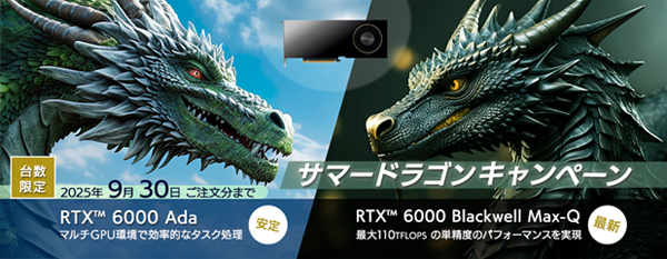 AIとビジュアライゼーションのソリューションカンパニーである株式会社ジーデップ・アドバンス(GDEP Advance,Inc. 本社:東京都中央区、代表取締役CEO:飯野匡道、東証スタンダード 証券コード:5885)は、2025年6月16日(月)より、アカデミック(学校教育法で定められた教育機関)ユーザーとNVIDIA Inception Programパートナー向けに、「RTX PRO 6000 Blackwell Max-Q Workstation Edition 」および「RTX 6000Ada」の2機種を対象とした「サマードラゴンキャンペーン」を台数限定で開催いたします。