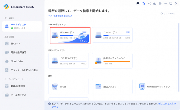 Excelファイルが失われたドライブ(例:Cドライブ、Dドライブ、外付けHDDなど)を選択し、「スキャン」をクリックします。