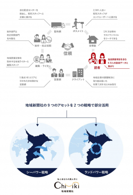 当社は、地域密着型の生活情報誌『ちいき新聞』の発行を軸に、情報発信および販売促進の総合支援事業を展開しており、年間約7,000社にサービスを提供しています。千葉県を中心に毎週発行している『ちいき新聞』は、専属の配布員により174万世帯へポスティングされ、創業以来40年以上にわたり配布を継続してきたことで、他に類を見ない9つのアセットを築いてきました。