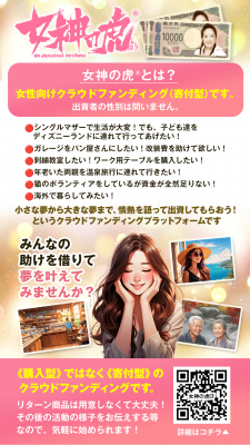 【女神の虎】は、女性が自分の夢や想いを公に語り、それに共感した支援者から資金や応援を受け取ることができる、女性応援型クラウドファンディングプラットフォームです。