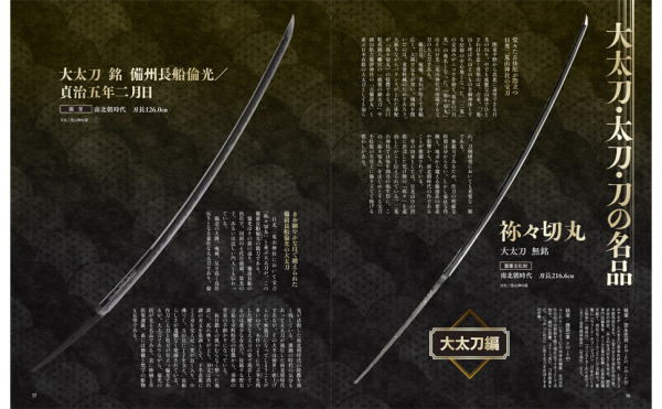 第1特集では大太刀・太刀・刀の名品を39振紹介。「大太刀」編は祢々切丸、長船倫光(日光二荒山神社)、豊後友行(大山祇神社)、千手院長吉(大山祇神社)、志田大太刀(彌彦神社)、破邪の御太刀(花岡八幡宮)、青江の大太刀(真田宝物館)など。