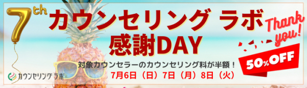 「カウンセリングラボ7周年感謝Day」は、カウンセリングラボの開設から7周年の感謝企画の一つとして、対象カウンセラーの電話カウンセリングを相談料50%オフで受けることができます。