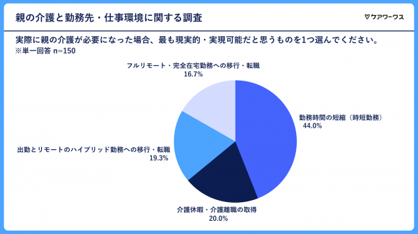実際に親の介護が必要になった場合、最も現実的な選択肢として挙げられたのは、「勤務時間の短縮」(44.0%)という回答で、大半を占める結果となりました。