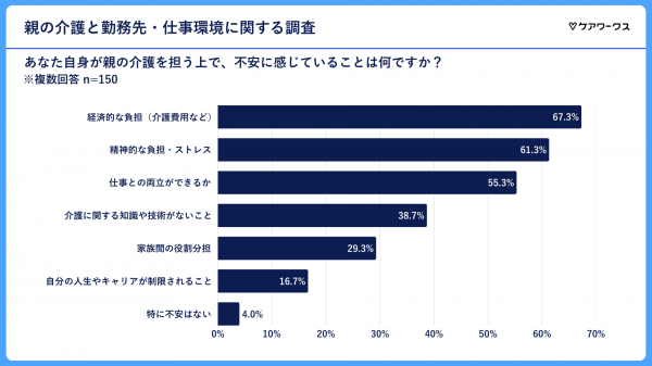 自身の親の介護に対しての不安を聞いたところ、最も多かった回答は「経済的な負担(介護費用など)」(67.3%)でした。次点が「精神的な負担・ストレス」(61.3%)で、3点目は「仕事との両立ができるか」(55.3%)でした。これら3点は、それぞれ50%を超える回答を集めており、大きな介護に関する不安と言えそうです。