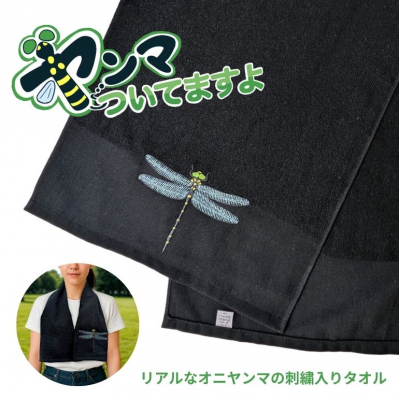 「ヤンマついてますよ」は、オニヤンマの姿を実物大で刺繍したインパクトある黒タオル。