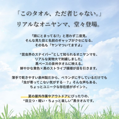 本商品は、黒地の泉州タオルに実物大のオニヤンマを刺繍した、インパクト抜群のタオルです。