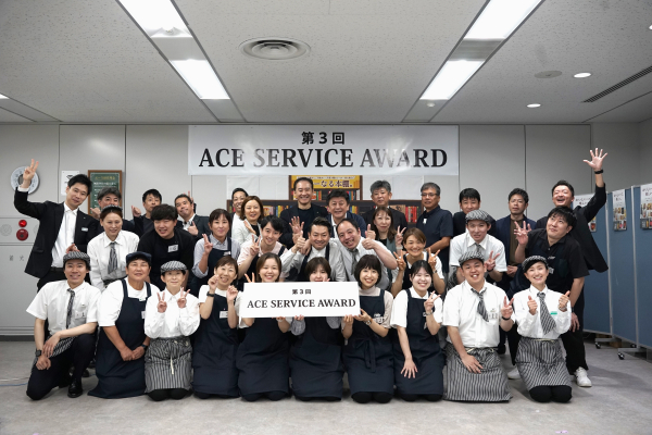 本大会出場者は店頭にて、「ACE SERVICE AWARDバッジ」を着用しています。お客様へ食を通じた「幸せ時間」を過ごすお手伝いができるプロフェッショナルの象徴です。バッジを着用したスタッフへお気軽にお声がけください。